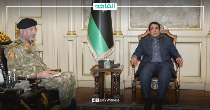 وأشاد المنفي، بما يبذله الجيش الليبي من جهودٍ لدعم ركائز الأمن والاستقرار على كافة الاتجاهات، مؤكداً إعادة تنظيم المؤسسة العسكرية وتعزيز الجوانب المهنية والانضباطية وتطوير الكفاءات، وتوحيد الهياكل الإدارية، تعزيزاً للدور المهم للجيش الليبي وما يقوم به لحماية الدولة ومقدرات شعبها، فضلاً عن دوره في التعاون مع كافة الأجهزة الأمنية.