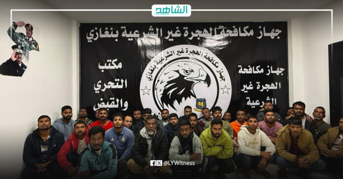 كشف جهاز مكافحة الهجرة غير الشرعية في بنغازي عن توقيف 32 مهاجرًا غير نظاميين من الجنسية البنغالية، بينهم شخصان يشتبه في ارتباطهما بعمليات تهريب البشر وتحويل الأموال المتعلقة بها.
