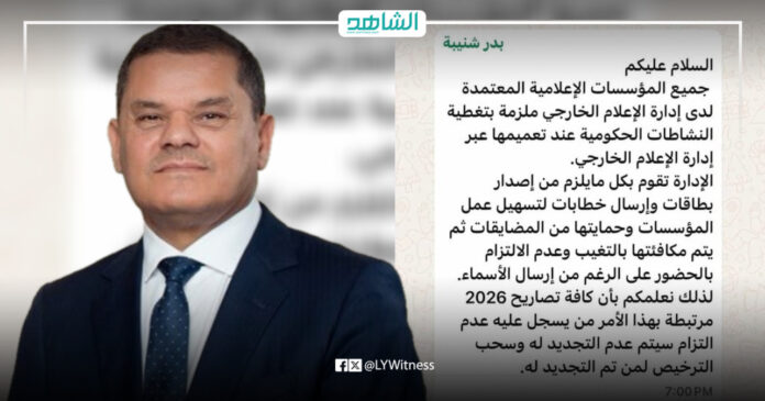 وكان مدير إدارة الإعلام الخارجي، بدر شنيبة، قد أرسل مساء الأربعاء رسالة إلى مجموعة على تطبيق “واتساب” حذّر فيها ‏جميع الصحفيين والمراسلين من أن عدم تغطية كل مؤتمرات وأنشطة حكومة الوحدة الوطنية سيُقابَل بسحب التراخيص ‏والاعتماد. واطلعت صحيفة “الشاهد” على محتوى الرسالة، التي جاء فيها النص التالي‎: “جميع المؤسسات الإعلامية المعتمدة لدى إدارة الإعلام الخارجي ملزَمة بتغطية النشاطات الحكومية عند تعميمها عبر إدارة ‏الإعلام الخارجي‎.. الإدارة تقوم بكل ما يلزم من إصدار بطاقات وإرسال خطابات لتسهيل عمل المؤسسات وحمايتها من المضايقات، ثم تتم مكافأتها ‏بالتغيب وعدم الالتزام بالحضور على الرغم من إرسال الأسماء. لذلك نعلمكم بأن جميع تصاريح 2026 مرتبطة بهذا الأمر؛ فمن ‏يُسجَّل عليه عدم التزام لن يُجدَّد له، وسيُسحب الترخيص ممن تم تجديده له”.