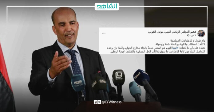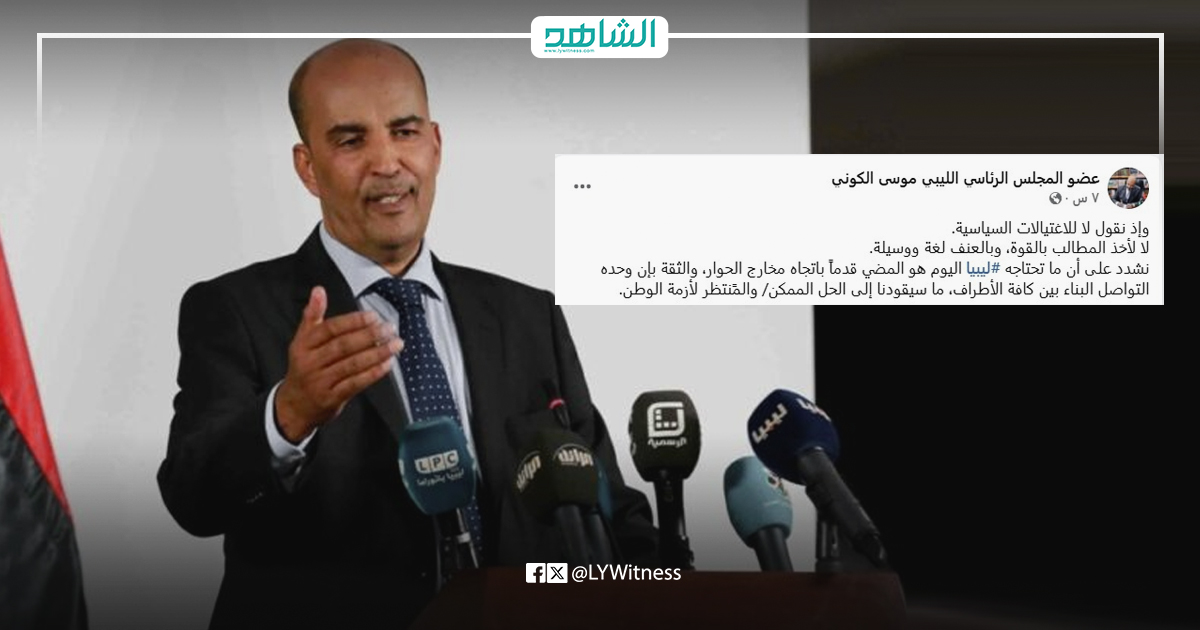 دعا عضو المجلس الرئاسي موسى الكوني، إلى نبذ العنف والاغتيالات في ليبيا، قائلاً: “لا للاغتيالات السياسية أو أخذ المطالب بالقوة”.