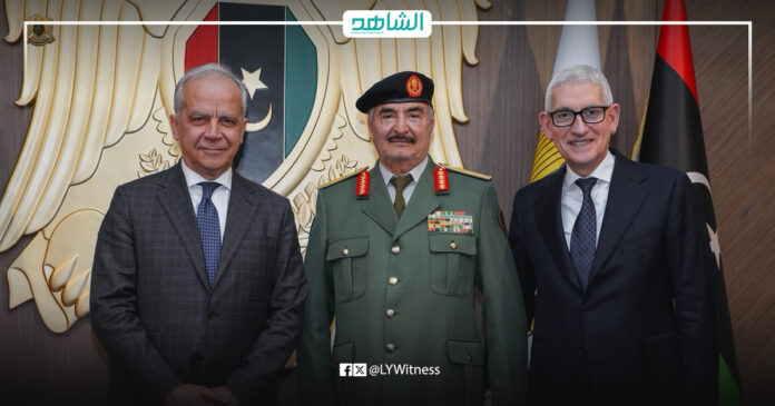 استقبل القائد العام للجيش الوطني الليبي المشير أركان حرب خليفة حفتر، اليوم الأربعاء في مكتبه بمقر القيادة العامة بمدينة بنغازي، وفدًا رفيع المستوى من الجمهورية الإيطالية برئاسة وزير الداخلية الإيطالي ماتيو بيانتيدوسي، ورئيس جهاز المخابرات الإيطالي جيوفاني كارفيلي، وذلك في إطار التنسيق والتعاون بين القيادة العامة والحكومة الإيطالية.