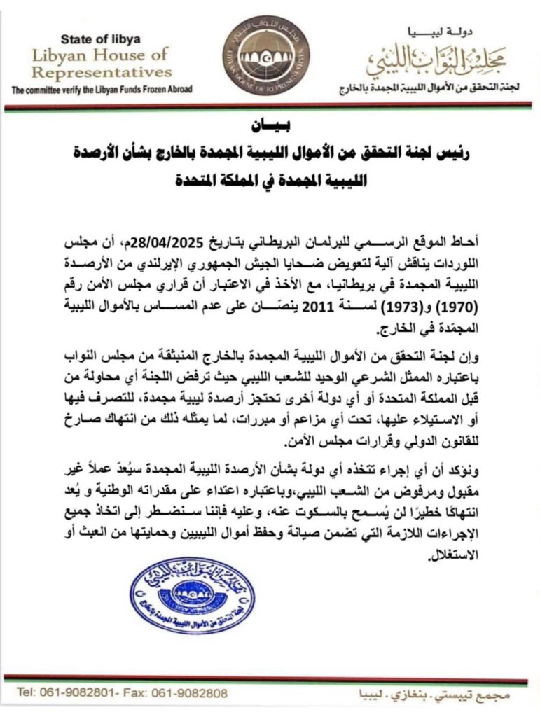 أعلنت لجنة التحقق من الأموال الليبية المجمدة في الخارج، التابعة لمجلس النواب، رفضها القاطع لمحاولات بريطانيا أو أي دولة أخرى التصرف في الأرصدة الليبية المجمدة.